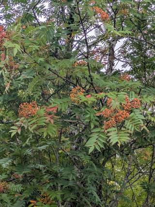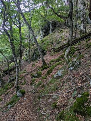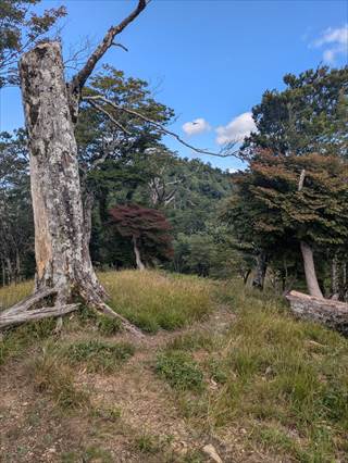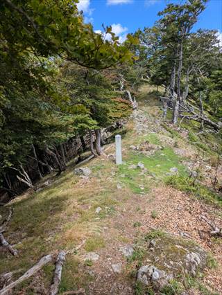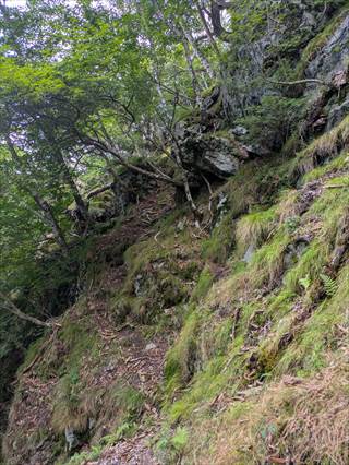 小屋から行者環岳に向かい登る トラバース部分にはステンの鎖が作られ新しい階段が出来ていた 見た目は綺麗だ ![]() ![]() 階段傾斜の緩い所はまだ良いが、傾斜階段は段差が大きく素直に登れない 足は手で持ち上げなければ次に足が乗れない後期高齢者は手を使い這い登った 整備は有りがたいが、いっそ梯子設置の方が登りよいような気がする 兎に角段差が凄い、段差が大きすぎる 水は一か所パイプが増やされ、谷間のタンク下は水が枯れていた ![]() ![]() 階段で疲れ切るショウタンは、早々と行者環岳はパスと尾根を歩く ![]() ![]() ![]() 途中の小ピークは巻いたり越えたりと踏み跡を追う 一か所、巻き道に釣りこまれるのか、尾根越えの所が、巻き道は濃い踏み跡に成っていた ![]() ![]() 巻き道は行けないこともないが険路だ 引き返し尾根を越えた ![]() ![]() ![]() ナナカマドが綺麗だし、また足幅が合わない階段が出来ている 折角の整備が残念だ 水簾の滝分岐(周回コース分岐)石表が出る |