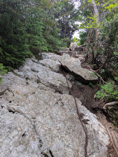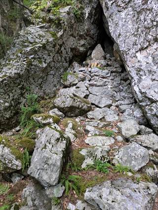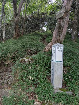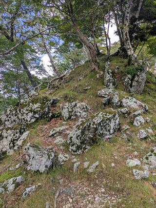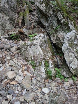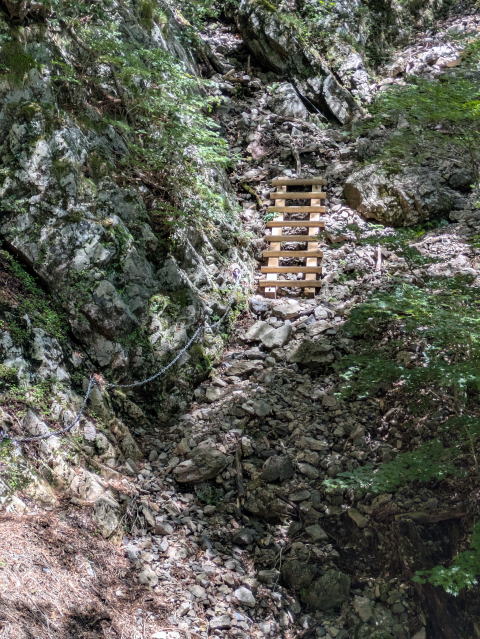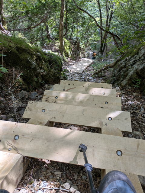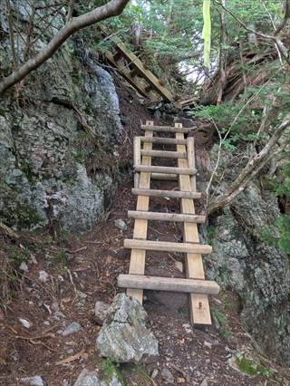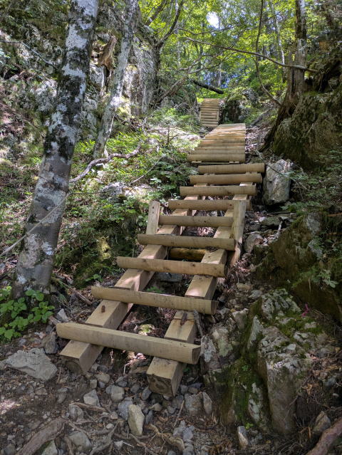 帰路は、下りが苦手な私だが、階段の段差が大きく曲がらない足は本当につらかった 高齢者でも健脚な方は良いが、少し傷みや疲れが出れば大変だろうな ![]() ![]() 大きなギャップとみなしケルン 行者環岳の階段 ![]() 脚力が無く足が曲らない関節、おまけに軟弱でこの階段下りが本当につらかった アノ弥山川コースでも梯子なら登れるが階段なら事故の連続だろう 階段整備は難しい 折角お金をかけ整備するならもう少し段差や角度を考慮してほしいと思った 安全のために対面して下った |