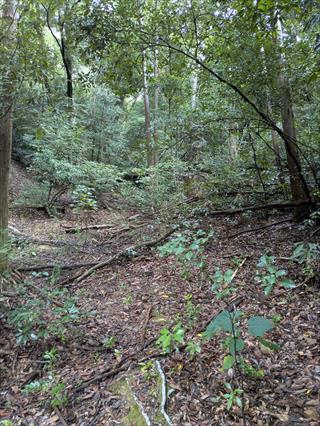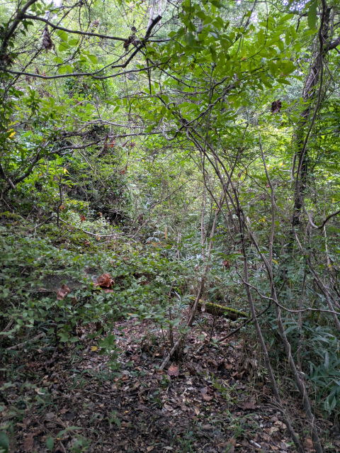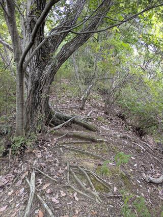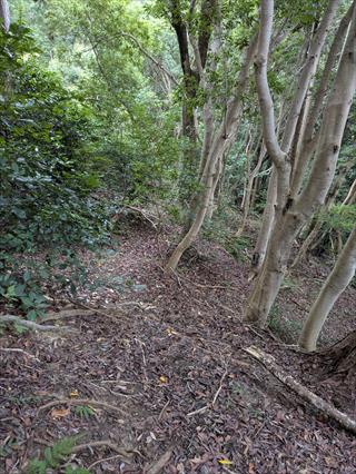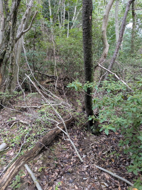 他の山を計画していたが雨情報が出る 単純なコースの山だったが、渡渉が二カ所ある 家の前の小川を見れば、通常の二倍の水嵩だ 一応中止で、午前は雨は大丈夫と紀の川市の元気の森から派生するマイナーな尾根を登る計画を立てた 駐車は根来寺横に有る民俗資料館前に止めた ![]() ![]() ![]() 根来寺参詣料金所前から墓地方面に入り、墓地手前から根来寺大塔(国宝)裏のフェンス沿いを行く 二体の石仏が有る。フェンス沿いには道はないが、行き詰まる所に山肌に古い道が出る 全く整備は無い 道成に登れば広いU字谷中を登る。道跡は感じない ![]() ![]() ![]() U字谷が詰まると右手の尾根に登るが、ここで現在地を見ないとピークまで出てしまった 見通しが効かない山で注意しないと尾根を外す事になる ![]() ![]() ![]() 尾根の状態が良くて(左)この程度です。 尾根芯を通れない時は尾根を外し斜面を通った(中央) 植物は少ないが少し大きめの葉っぱが有った 一瞬クリンソウかと思ったが、よく考えると湿気を好むクリンソウは尾根には生えない💦 |