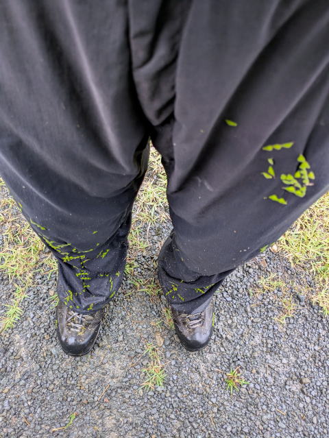 見覚えのある境界杭を見つけた この付近に下る分岐が有るはずと思い尾根を行けば、尾根は下る (゚д゚)(。_。)ウン、登るはず下る(゚д゚)(。_。)ウン、GPSで現在地を見ればアララ尾根を外していた 尾根分岐に登りルートをただす ![]() ![]() 見覚えのある看板が出て、元気の森ハイキング道に出た 根来山はあきらめた 雨が降り出した ハイキング道に出れば笠で十分と雨具は無い 途中の小雨は笠はさせない。ずぶ濡れだ ハイキング道は傘を差して降るが、最後の急坂は注意がいる ![]() ![]() ![]() 左ハイキング道、中央は尾根先、林道を歩き墓地に出る ここまでの林道歩きでヌスビトハギの種がバッチリと付く ![]() 種も外さず車に乗る 帰って種取りに反省を込めた |