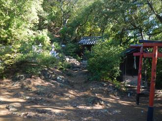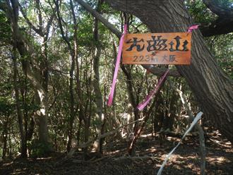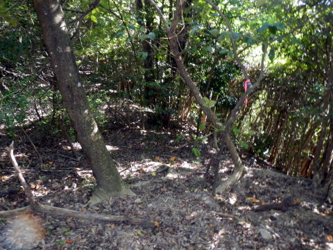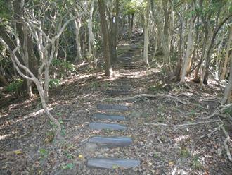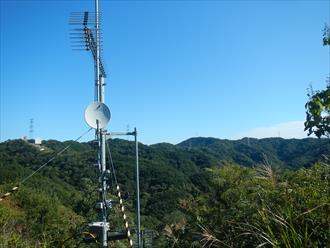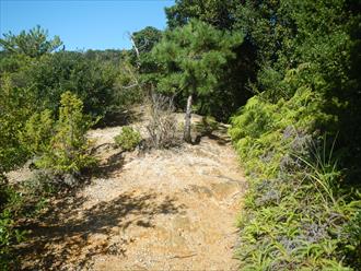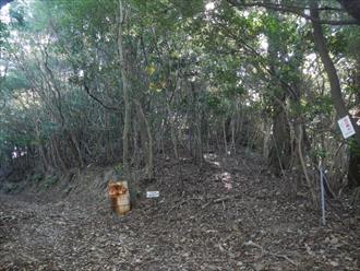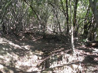 ![]() 登山道は傾斜もあり、汗を流す 道は登山を感じる石道で、両サイドはウバメガシの森が美しい 山頂近くになれば、テレビの受信アンテナが出て、その先に反射板や、飯盛山山頂が見える 山頂は高野山(たかのやま)の古城跡で堀切や曲輪が感じる山城跡だ ![]() |