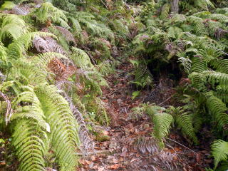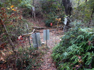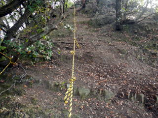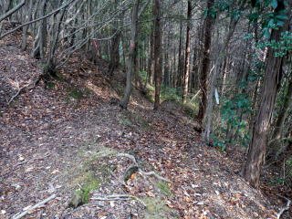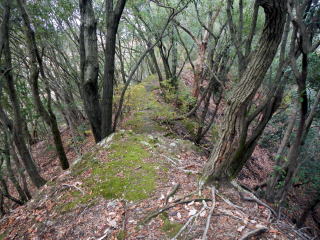| 引き返し、見晴らしの良い馬の背尾根を下る 尾根から30m程度斜面を下り林道に出る 植林内の道は下り良い ![]() 大山への案内はない 林道で滝の池の滝尻の三叉路を大山に浮かう 林道は少しぬかるむ所も有ったが、通るに問題は無い 林道分岐を確かめながら、鉄塔道標が出る所から尾根へと取り付く 見落としやすい、注意がいるだろう ここから尾根まではなかなかワイルドの管理道です 下りに利用するなら険路と表現したいトラバース道でを登る ![]() 巻き道に入りトラバースで登るところは〇危だ ![]() 巻き道に入り巻き登れば羊歯の中の道を探りながら大山を目指す マークは少ない 大山は三角点大山谷が鎮座する平らなピークで私有林です ![]() 三角点点の記は 等級種別 三等三角点 基準点名 大山谷 北緯 34°20′41″.1754 東経 135°20′25″.7207 標高(m) 382.73 所在地 泉佐野市上之郷 私有林内 意味が解らない白峯はどうやら個人名かGP名のようです AIで探ればあちこちに似たようなものがあります 縦走路に向かって登る |