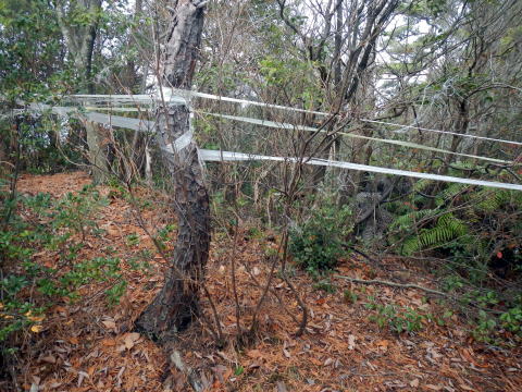 わいわい村の第二駐車場に車を止めてササ峠に向かう 地図から分岐を探り殿尾山直登の破線を探る ![]() 右端の写真で掘河谷に下り、谷川を橋で渡り破線を探れば、取り付き谷に立ち入り禁止の看板が出る 山は開けても立ち入り禁止は通年だろう。山明けの立ち入りができる山は、日程が書かれて立ち入りが許されるがここは無い ![]() 谷向うに耕作地が見え、橋を渡りここだろう道を覗けば(中写真)立ち入り禁止だ 破線は行けない、東側の緩やかそうな尾根を登れば行けそうだ 破線は昔下調べをした記憶があるがその頃は立ち入り禁止の記憶はない 小さな紐の印をみけ道らしいところに従った 道はすぐになくなり、樒の木の植林内を探りながら尾根にとりつくと あらら、整備跡のある道が出たがマークはない ![]() 道なりに登るが現在地はつかみにくく、GPSをカンニングしながら登ってゆく 地図には崖マークが出るが、問題がない ただ、手入れは立ち入り禁止が納得できる整備がある尾根だ 道横を荒らさないように道を見定めて登るが、道を外したのか道が消えブッシュに突き当たった やむを得ずブッシュに突っ込めば、行けないこともないが未経験なら多分あきらめるブッシュだ 突然紐が張られた道に出る。 一瞬、お菊山からの尾根道かと思うが、少し道を探りGPSで現在地を見れば、殿尾山にまだついていなかった ![]() 方向を殿尾山に変え歩けば、山名版が出た 直ぐ先で縦走路に出るが、以前あった殿尾山の案内板がなくなり立ち入り禁止の看板が目立つ ![]() 縦走路から20~30m奥に殿尾山の山頂がある 殿尾山はお菊山の尾根で最高所に成ると地元の方が教えてくれた 下調べのため348mピークに向かう ![]() 348mピークは鉄塔管理のため低木が切られ見晴らしは最高だ 多人数なら昼食はここが良いだろうなと、山仲間にラインを入れた ![]() |