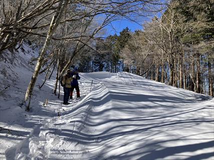 林道に下りその先で登れば三角点が有る 千の時だ![]() 名の由来はわからない。国土地理院に資料が有るのかもしれないが、公表された中にはない ![]() 点石を探したが雪で見つけられなかった 20分ほど休憩だ 予報は当たり、風は収まり青空が覗く ![]() |