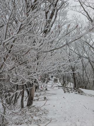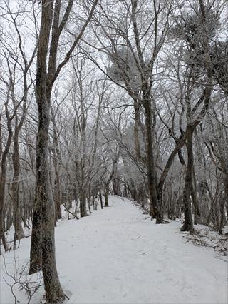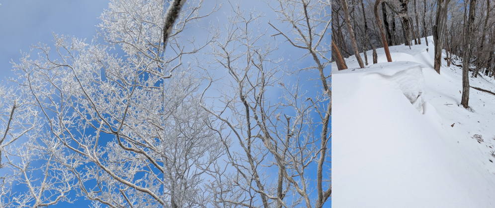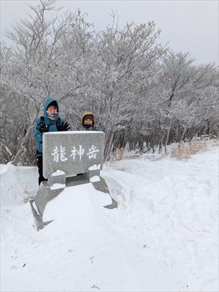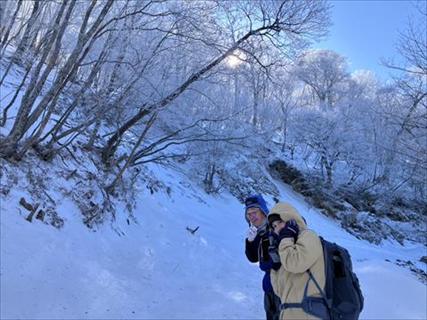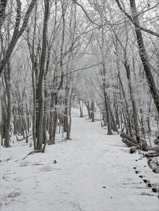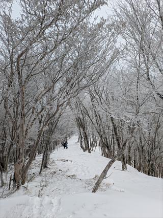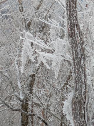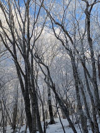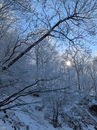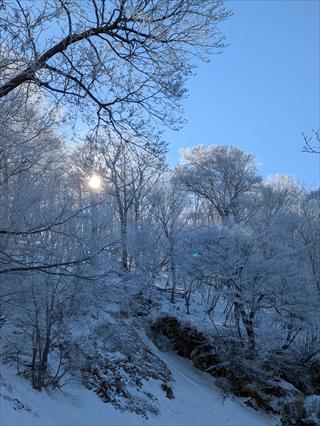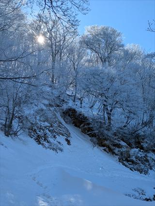 途中で昼食タイムをとって林道で帰えろうとしたが、雪が深く 龍神岳は尾根で越えた ![]() 風も収まり、樹氷を照らすお日様は本当に美しかった ![]() 龍神岳に登り返す |