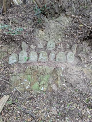 集合は和歌山市深山の駐車場に9時40分を設定し、電車で来られる方は9時過ぎ着の南海みさき公園駅としていました もちろんみさき公園前を通り深山に来られる方が、みさき公園で電車組を乗り合わせる事になっていました 和歌山市深山へは交通の便が悪く、公共交通機関はありません 一般的には、南海加太駅からタクシーが基本のようです スタート時間は遅れましたが、健脚の皆様で周回時間は予定時間に収まりました スタート点は深山第一砲台駐車場からです ![]() チョット写真が少ないために記事は地図を参考に宜しくお願いいたします 砲台跡から東屋の有る展望台から、旧砲台の巡視路に入り、古道の大川峠に向かいました ![]() 古道大川峠には地蔵様、お稲荷様、社、石仏、14体の阿弥陀様が祀られています 孝子峠越えが厳しい関所が有ったのか、庶民は大川峠を超えたのかもしれません 車社会の今は、旧道は自転車道として、車はトンネルで抜けられます |
