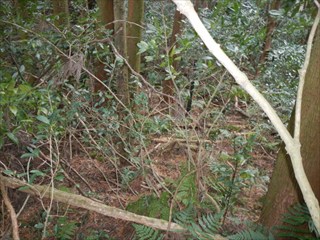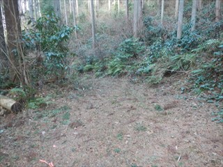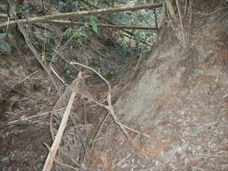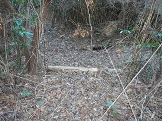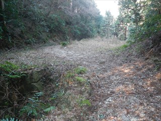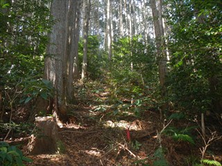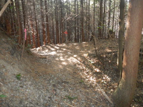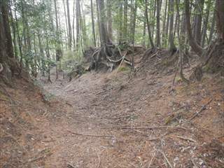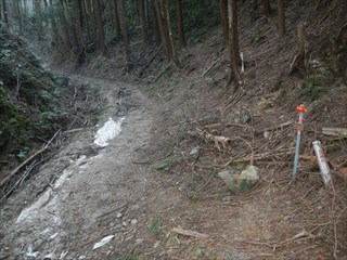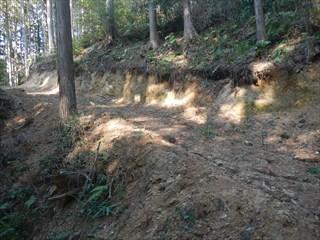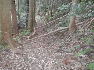 あらら、100mも下らない アラー林道だ 林道は地図には載らないが、見た感じはどうやら地形図破線の西下に通っているようだ 私の携帯には出なかったが、sunaoさんの携帯ではヤマレコの足跡が林道に出て、途中で引き返している 林道が終わっているのだろうかと話は合う 行けばわかると判断の早いsunaoさんは歩き出す 林道が分かれた GPS確認から、右手上に破線が載る 右手だ これまた判断が早い 登れば林道が尾根で終わり、尾根に破線道が残る やったー 思ったより歩きよい 小さな分岐尾根では必ず方向は確かめた 直ぐに見晴らしの良いピークが出た その先で堀切が出る これは小さな曲輪が有ったのかも 見晴らしがよいからだ 方向を確認する GPSも見た 間伐材は歩きにくいが、通れる 道が有ったのだろう 下に林道が見えた 最短で下った 下って地形図と現在地を合わせれば、そのまま林道を下れば良かったのだろうと話し合う 右手上には古道が残るはずと、ずずと登ればやはり古道跡が出た 林道が新しい道ということだ |