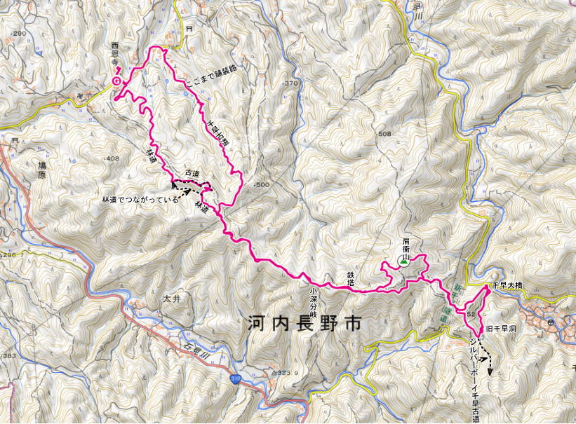 | 千早赤阪村の西はずれに古刹の西恩寺が有る 今日も西恩寺駐車場に車を止めてのスタートです 駐車許可は院主様と大先輩と私が、千早古道を通る時と整備時に駐車の許可を頂いている 西恩寺 西恩寺の庭は季節の花々が美しく、春夏秋冬花を楽しめる 今日は白い椿と蝋梅が目立った 本堂で手を合わせ、千早古道に入る 車道を北東に下り写真の分岐から山へと入る 道の両脇には大邸宅が建ち歴史を感じる集落内を登る 一汗かくころに集落が終わり、切り取り道の壁には千早古道の看板が出る その先で農道と千早古道が分かれる所に新しい道標ができていた 努力が実ったのか何やらうれしい いかにも古道らしい道を汗を流しながらゆっくりと登る 何年か前だろう 千早小学校の生徒たちが残した道標が出る 道標のコースはほぼ踏査はしたが、これも西原先輩が下調べをして私を案内してくださったからだ 道標に沿う 鉄塔管理道として利用される部分は特にきれいだ 太井との変則分岐にも千早小学校と先輩の道標が有る この分岐はよく見れば変則四辻で、道標先は軌跡を残すが谷に下る部分は軌跡がなかった(最近は軌跡ができた) この降る部分の踏査を西原先輩 (https://www.yamareco.com/modules/yamareco/userinfo-55475-prof.html)と話し合っていた そのような話をしながらsunaoさんとわいわい 道は通っていれば草木も生えないが、通行がなくなれば山は戻るのはすぐだ 小学生が残した道標や、整備時に同行した方が、悪戯のように書き残した切り口は懐かしい 道標や分岐の道標、肩衝山への案内当が出る まずは千早大橋に行く 少し倒木も増えた 鉄山行者は流石に古くからこの道を利用していたようだ 途中に絶滅種に入る花が群生していた 少雨で花咲が少なかった2025年、一二輪咲いた花を写そうと下のだろう、大団体のグループが花を踏みつけ絶滅状態だ これを、守ろうとしているが希望は少なそうだ |