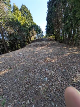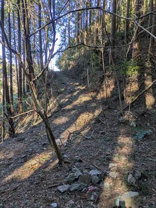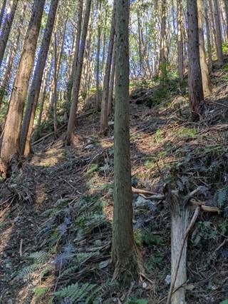 | このまま下山は早いと大野城跡に向かった 記憶で歩き地形図は見なかった 記憶ではピストンが頭に残る ![]() 所が反射板まだはフラットだがそこからはアップダウンが出る 小ピークや道のアップダウンで下り基調だが、帰路は登りになる リュックも重く体力が落ちた今ではと頭にエスケープが横切る ![]() 携帯でやヤマレコ軌跡を見れば大野城跡東側尾根や、城跡北側の尾根を直に下る跡が有る 大野城跡はいつもきれいで、昭和三年の石柱が建ちいかにも城後らしい 北に二段の曲輪とがあり行ってみる。 尾根先は守りのためだ急傾斜で、エッ、これを下るのと思う急傾斜だ 地形図に乗る破線は行けるかとか頭に迷いが出たが、林道まで地図では標高差40m程度だ 行っちゃえと、恐る恐る降る 落ちても左なら大けがもないだろうとそーと降った 尾根先らしいところで下を見れば林道が見えた 途中は伐採が有る 多分林道に下りるには道までは壁だろう ヤマレコ足跡は有るが、多分引き返した物もあるだろうと考え 谷の下で林道が終わっているから多分そのまま下れるだろうと谷に下る 来た道を引き返すよりよほど時間が早いだろう 下ったが、羊歯で足元が見えず、つかむ木はなく一歩ずつ足元を確かめ時にはお尻を使った 汗 一か所でズルって滑ったが植林につかまりやれやれ、下れた 予測は当たり林道終点に下りた ![]() |