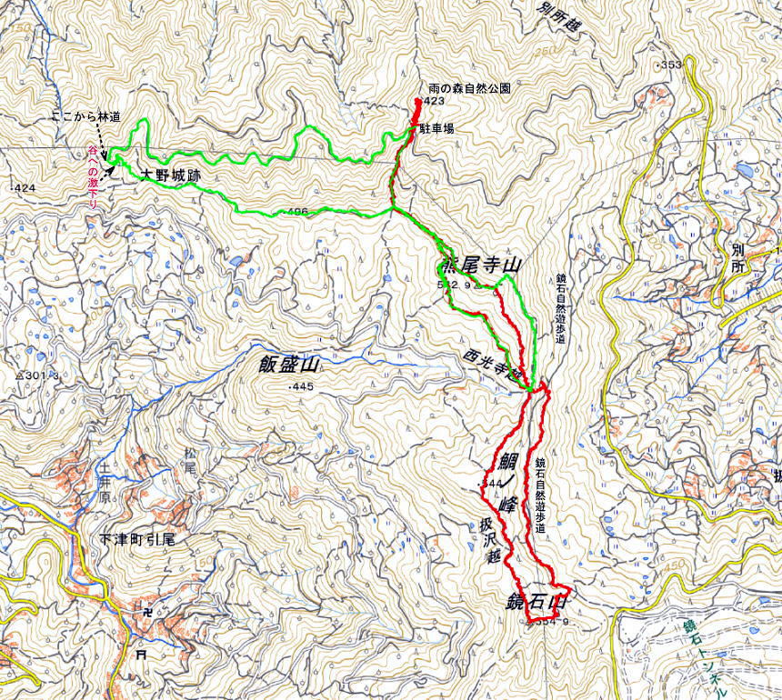 | 直ぐ上が平らな555mの鏡石山だ 山頂は削平されているようで大野城と何らかの関係が有るのだろうか ![]() 昼食をすまし鯛の峰の東下を巻く鏡石遊歩道に下る ![]() 遊歩道は破線と少しずれるが鉄塔管理道として整備されたところを下ればよい 朽ちた看板が付けられた鉄塔道標から水平に北に歩く 杉の下で枝が少し落ちるが歩くに問題は無い やがて道は開けルンルンだ ![]() 分岐が出る 登れば汲沢越(ぐみざわごし)だがその先の西光寺越しまで下る 鏡石自然遊歩道の看板が落ち鉄塔管理道標が有る所を登る モトクロスバイクが轍を作り道が彫れる 落ち葉が積もり標高差50mのこのコースの最難路です? ![]() 登山道に登れば西光寺越しです その北側20m程度に熊尾寺山西を巻く道の入り口はあるが道標は無い ![]() 巻き道には跨ぐに高く潜るに低い倒木が数本有り完全に道をふさぐ倒木が有ったが 超えたり巻いたりして通った。この時に撤去をしてみようと思いました 雨の森駐車場に下ると少しは見晴らしが出ていた 。 |