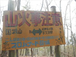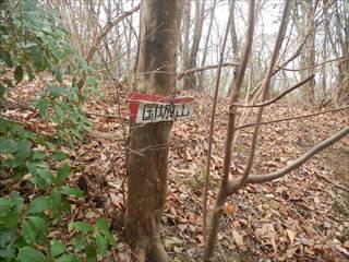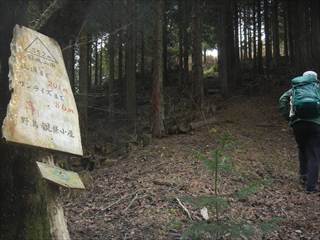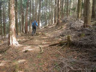 まず山頂に向かう 山頂は見晴らしもなく間伐材が転がる ここで昼食と座り込むが寒かった |