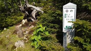 京奈和道で出口を間違ったり、篠原で道を間違ったりと予定登山時間を大きく遅れた オマケに湯ノ又登山口は、釣や沢、岩登りの方の車で満車、作業用の広場に停めさせてもらった 取付きに道標も有り、登山口は伐採され、中尾が厳しい登りを見せる状態だ ![]() 傾斜は有るが登りよい尾根でWストックでルンルンと登った 途中に、道標と明星ヶ岳までの距離が書かれている 旧友はどうも距離表記はオカシイと言うが、信じれば表記は有り難い ![]() 登り一辺倒で尾根間違いなどは先ずないだろうが、小さな凸ピークは幾つかあった ![]() 1325mピーク付近から、神仙平や七面山、大峰奥駈道が見晴らせるようになる 少しづつコースは険路の様子をみせ始める ![]() 1383mピークは北側を巻くが、道標は多分クマにかじられていた 少しづつコースは尾根中央とは行かなくなるが、倒木処理が有り通りよい 踏み跡も濃い ![]() |