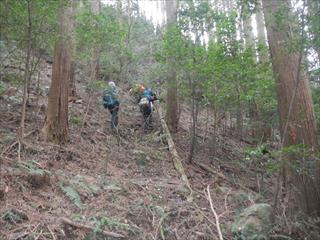 | 歩き良い道だが殆ど踏み跡は無い 小さな沢越えの橋が朽ち、沢内を100m少し歩き山肌の道に登った ![]() 時々小さなマークが打たれてるが見のがすほど小さい 道を感じる所を進めば、段々と急坂に成り、木を持ち根を持ち這い上がった ![]() 今日のメンバーはバリバリと登るのが好きなようで楽しそうに登ってゆく 最後尾を登る私はフー ![]() |