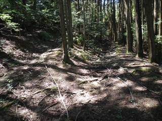 | 目標地点は複雑な三差路で、教えていただいた谷道に入る 地形図は黒実線だが林道のようだ ![]() 谷沿いを登る 分岐が出る 直進が林道で上道が古道だ 状態が良く踏み跡も濃い オッ道は良いと状態の良い道に釣り込まれた 墓が出る。お参りの方がくるので状態が良いようだ ![]() 柿木の畑に出た 墓も有る。古道だと地図も確認せず道を探す馬鹿たれショウタン、??道が無い GPS確認をするが破線道を少し外すが、地形図との違いの誤差内だ??うろつく ここで地図を見れば谷沿いだ 下ってみてみるが谷沿いに道は無い?? ジックリと探せば踏み跡が無いが道が見つかった 墓側が綺麗で破線道は踏み跡もない。 入れば状態の良い道に成った ![]() 少しアルバイトで時間がかかったが白いスミレが美しかった 後は道成だが、一か所の倒木と道抜け地点はやや通りにくい 這い潜り巻き超えた 道抜け地点は踏ん張りが効かない足はオットット、滑りに頑張った その先で道が平行に分岐して取水パイプが放棄されている ここは地形図を確認する 上側が古道だろうと登れば尾根越えの状態の所に出る 古い農機具が放棄され、大きな檜が生え倒木が道をふさぐ ![]() 鋸が有れば小枝を切れば通りよいがそれが無い 方向を確認した 確認方向には道が無いがその下に林道が有った 地形図には破線で書かれたものだろうと判断して入る 実線の道側は笹が生えこみ道が消えていたのかわからなかった ![]() 林道だ 黒実線道かもと踏み跡らしい所で左手の尾根(畑跡)に入って道を探すが無い 林道に下った たぶん林道前はこの尾根に道が有ったのだろうと感じた 林道は状態が良く終点は車がUターン出来る広さだ ![]() 林道終点付近はカケマツかと思ったが、両サイドが山の位置と合わない |
