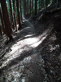 | 緩やかに下る 道も良い。ルンルンだが段々と傾斜が出て、ゴロ石道に成り足元注意での下りだ 大畑集落に下り回り道でもと考えるほど足元が悪かった ソウコウしていると、矢印が出てこれに従った やはり道が悪い 道が良くなる所に廃屋が出て、大畑に下りこんでゆく ここまで来たのならと、小さな分岐から尾根に登り返した ![]() 緩やかだが登りには汗が流れる 尾根道に登り切れば後はルンルンだ |