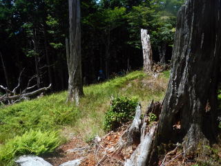 | 下山は、釈迦ヶ岳山頂のお釈迦様修復時の材料を降ろしたコースです 私と、新宮山彦ぐるーぷの強力が、台座の雨侵入防止銅板の残りを担ぎ降ろした 25kg と 35㎏だったが、自分のリュックも加算する 私は30kg少々だが強力は45㎏に成った 少しでも早く林道に出るために取ったコースです 道標で不動木小屋林道に向かって下る(登って来たコース) 旧登山コースは重量物を背負って下るには不向きだ 途中から西に分岐する植林の中に下る 分岐目標は、倒木が有る広い所だ ![]() 分岐目標は倒木の有る所です 西側に植林が見える ![]() 私は植林の中を真っすぐに下り杣道を掴んだ リーダーは植林の境界から杣道を探っていた 下ると杣道が出て、植林テープが道を記していた ![]() 杣道に沿って下れば、小さな谷を横切り、下ると少し踏み跡が薄くなり方向を探る 私の記憶は殆ど無い 下ったのは此処かと訪ねたくなるほどだ 道を掴めば別に険しい所は無い ![]() 林道が見えだす頃に仲間が渋滞を起こしている 意味が分からなかったが、記憶で谷中を下った 私は単独で標高差20m程度を谷中に取ってみたが、道は無い 岩の隙間を上手く下ったが、どうやら谷道は流されたようだ ![]() 林道に出て、渋滞の意味を聞けば梯子が出て朽ちているとの事でした 写真をもらった なるほど この梯子を掛けたのは強力さんだそうで、一度修復したがまた痛みが有るようだ 再度修復をしなくてはいけないかな 林道に出た ![]() 凸地に停めた私の車 登山口で解散した 新宮方面は乗り合わせ、大阪、奈良方面も乗り合わせるが、和歌山はいつも一人だ 単独で帰る 途中で、林道横に新しい林道が見えた 横に平地が有り、これは踏査が必要だと踏査する事になった ![]() 別記事として残します |