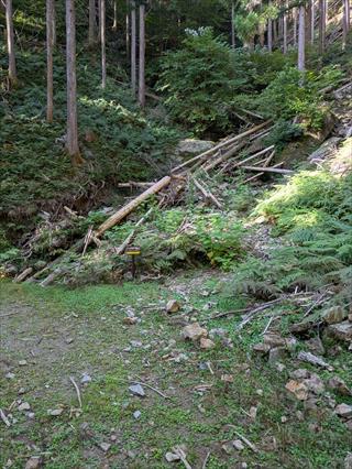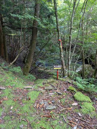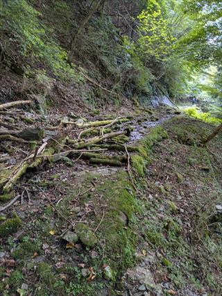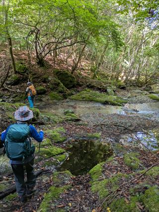 若い二人は50ⅿ程北側を下っていた 林道までは時間は変わらないが、距離は近そうだ ![]() 渡渉で靴を洗い手を洗い顔を洗った ハイカット靴なら水没は無い渡渉だった |