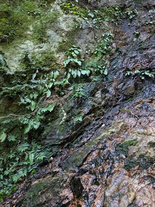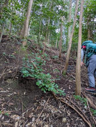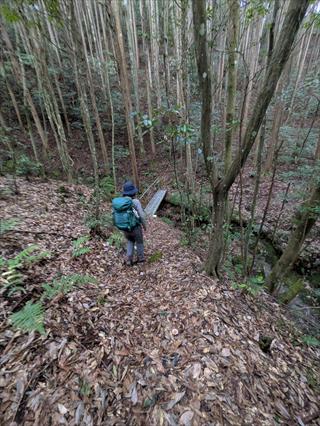 岩湧山に花を探しに行く予定とも知らずに、勝手に別山だと思い込み、地形図は別山を持っていた (^_^;) マア、岩湧山はほぼ全コ-スは頭に有るが、小さな地形の違いは記憶にない 第六駐車場に止め下り、ここに踏み跡があると道に向かえば、ヤハリ橋が有り直ぐに管理道とわかる ![]() ![]() ![]() 薄い踏み跡を追う 岩湧山でこれほど踏み跡が薄いコースも有るのだと急傾斜に息を切らす 地形を知るKさんはすぎこだちの道に出ると言うが、アノ急階段の道と思うだけで汗が出る ナルホドに出た 最初は思ったほどの急坂階段ではないが、階段は苦手だ 地形図が無い、ヤマレコ地形図ではどうやら管理道でも登れるようだ ![]() ![]() ![]() 道両脇の小枝が払われていた ボランティアさんかなと思ったが、草刈り機を使っているところから管理道の業者さんだろう 管理道分岐なら階段は無いだろうとか甘く考えて管理道をで登るが、考えは甘い 嫌いな階段のさらなる傾斜が出た ただ、登山道より階段の段差は無く距離も短い分良かったのかも 編笠山の尾根に出る ![]() ![]() ![]() 編笠山は通り過ぎやすい、ピークと言うより尾根だ 東タツガ岩に行った 元気な頃はこの尾根下からワイワイと編笠山にバリエーションで上り下りした記憶も濃い 見晴らしで、山座同定はやや忘れた部分もあるが略山頂はだろうで分かった 引き返し尾根を通らずに林道で下る ![]() ![]() ![]() 編笠山登山口に出て、車道か?林道に出た 経塚二番はパスだ お堂の横上で、ユックリとお昼を楽しむ 見える景色の同定は合っているのかそれは分からない ヤハリ地図は必要だ |