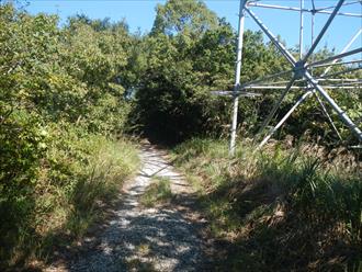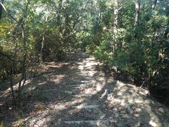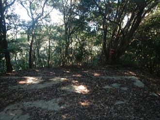 ![]() 登山道は傾斜もあり、汗を流す 道は登山を感じる石道で、両サイドはウバメガシの森が美しい 山頂近くになれば、テレビの受信アンテナが出て、その先に反射板や、飯盛山山頂が見える 山頂は高野山(たかのやま)の古城跡で堀切や曲輪が感じる山城跡だ ![]() |