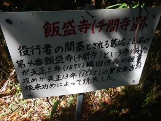 | 大門跡の道標が出る 上孝子から来れる谷道からの出会いだが、ここに大門が有ったようだ ![]() 次の分岐は札立山の縦走路でここからは近畿自然歩道になる ![]() 飯盛山に向かうがこの先に飯盛寺(千間寺)跡が有る 大門とは飯盛寺の物なのだろう ![]() この先で鉄塔が出て其のうえが飯盛山です ![]() 見晴らしもよく、中央の植木の下に三等三角点が有る ![]() 三等三角点、384.4m 三角点名は 飯盛山 |