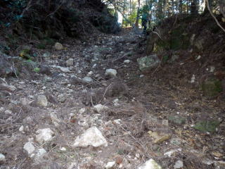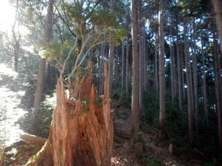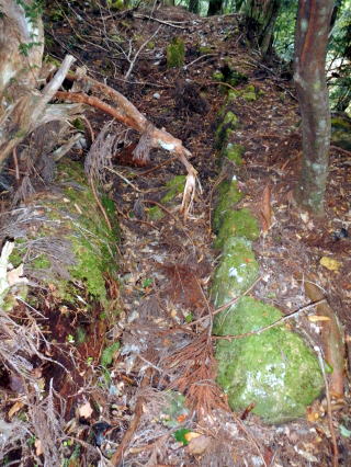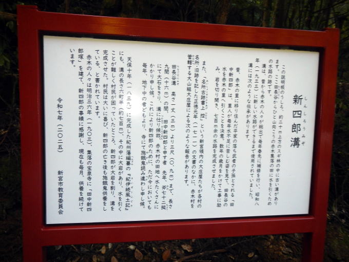後数百メートルと言うところに林道が分岐する角に新四郎溝の看板が出た ![]() 一寸読みにくいが20mうえに石の溝があるのが新四郎溝で山向うの田に水路をがあった話だ 余談だが、新宮山彦の山仲間もこの話をご存じで何処かの水路トンネルを探索途中だそうな ヤマレコに、林道から上の三角点まで踏み跡が濃いのは、水路と関係が濃いのかな |