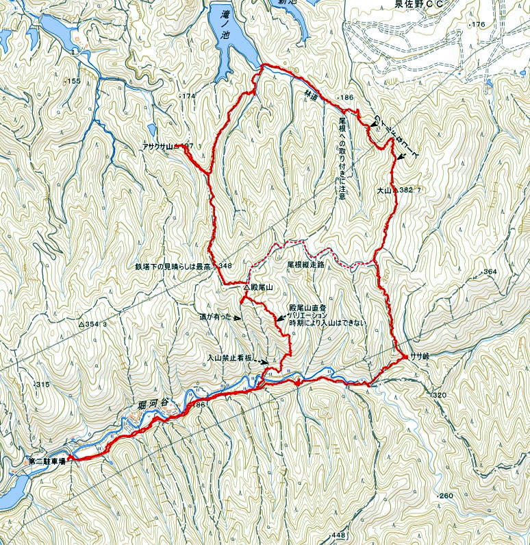 わいわい村の第二駐車場に車を止めてササ峠に向かう 地図から分岐を探り殿尾山直登の破線を探る ![]() 右端の写真で掘河谷に下り、谷川を橋で渡り破線を探れば、取り付き谷に立ち入り禁止の看板が出る 山は開けても立ち入り禁止は通年だろう。山明けの立ち入りができる山は、日程が書かれて立ち入りが許されるがここは無い ![]() 谷向うに耕作地が見え、橋を渡りここだろう道を覗けば(中写真)立ち入り禁止だ 破線は行けない、東側の緩やかそうな尾根を登れば行けそうだ 破線は昔下調べをした記憶があるがその頃は立ち入り禁止の記憶はない 小さな紐の印をみけ道らしいところに従った 道はすぐになくなり、樒の木の植林内を探りながら尾根にとりつくと あらら、整備跡のある道が出たがマークはない ![]() 道なりに登るが現在地はつかみにくく、GPSをカンニングしながら登ってゆく 地図には崖マークが出るが、問題がない ただ、手入れは立ち入り禁止が納得できる整備がある尾根だ 道横を荒らさないように道を見定めて登るが、道を外したのか道が消えブッシュに突き当たった やむを得ずブッシュに突っ込めば、行けないこともないが未経験なら多分あきらめるブッシュだ 突然紐が張られた道に出る。 一瞬、お菊山からの尾根道かと思うが、少し道を探りGPSで現在地を見れば、殿尾山にまだついていなかった ![]() 方向を殿尾山に変え歩けば、山名版が出た 直ぐ先で縦走路に出るが、以前あった殿尾山の案内板がなくなり立ち入り禁止の看板が目立つ ![]() 縦走路から20~30m奥に殿尾山の山頂がある 殿尾山はお菊山の尾根で最高所に成ると地元の方が教えてくれた 下調べのため348mピークに向かう ![]() 348mピークは鉄塔管理のため低木が切られ見晴らしは最高だ 多人数なら昼食はここが良いだろうなと、山仲間にラインを入れた ![]() |