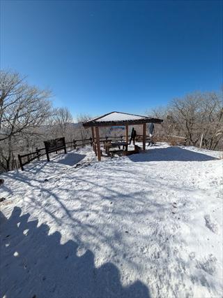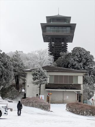 登山口の護摩壇山スカイタワー駐車場に向かう![]() まだ車は少なく余裕で止められたが、ドアを開けて踏み出せば、運転のシューズではオッと滑る |
