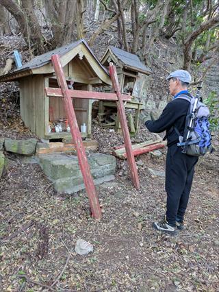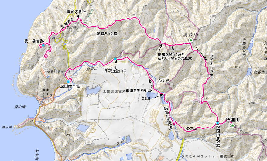 集合は和歌山市深山の駐車場に9時40分を設定し、電車で来られる方は9時過ぎ着の南海みさき公園駅としていました もちろんみさき公園前を通り深山に来られる方が、みさき公園で電車組を乗り合わせる事になっていました 和歌山市深山へは交通の便が悪く、公共交通機関はありません 一般的には、南海加太駅からタクシーが基本のようです スタート時間は遅れましたが、健脚の皆様で周回時間は予定時間に収まりました スタート点は深山第一砲台駐車場からです ![]() チョット写真が少ないために記事は地図を参考に宜しくお願いいたします 砲台跡から東屋の有る展望台から、旧砲台の巡視路に入り、古道の大川峠に向かいました ![]() 古道大川峠には地蔵様、お稲荷様、社、石仏、14体の阿弥陀様が祀られています 孝子峠越えが厳しい関所が有ったのか、庶民は大川峠を超えたのかもしれません 車社会の今は、旧道は自転車道として、車はトンネルで抜けられます |