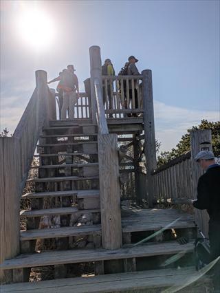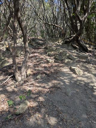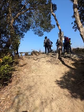 ![]() 写真では分かりにくいのですが道の様子です 一部、踏み跡道を登ってもらいコース確認もしました 距離が短いと時間も短いことが分かったが、お勧めできる行動ではありません ![]() 山頂に着いて、30分で昼食時間としました 山頂テーブルは少し傷んでいます 西下にも小さな風よけ椅子があります |