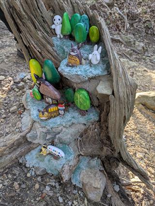 | 山頂からは四国山に向かいます 道標でルンルンです ここからは、石ころアートが次々に出ます 子供の登山も多いハイキング道ですから、山には不似合いでしょうが、楽しく見ればよくできています ![]() 道なりに歩けば四国山展望台に着きます 少し以前は壊れていましたが修復がありました その先の、地形図が書く山頂に行きました ![]() |