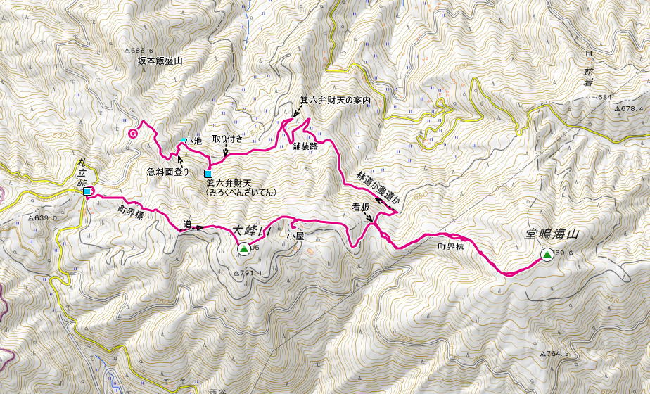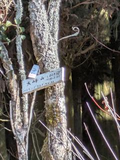 長峰山脈の大峰山、堂鳴海山、箕六弁財天(みろくべんざいてん) 2026/01/21 3人 ![]() 長峰山脈は和歌山県を東西に走る主な山脈です 南に白馬山脈がありますが山脈としてはあまり知られていないように思うのは私だけでしょうか 他に、いくつもの山脈が有るが、山脈名は地形図には載らない どの山脈も、高野参詣道や熊野詣の参詣道が走っていたようだ 大阪と和歌山の境界の尾根は紀泉高原とか和泉山脈とか金剛山地とか、 いくつかの名に分かれ何処からどこまでが何山脈とははっきりと区別はない しかし、どの山脈もどの山地も、宗教的な参道で、和泉山地は金剛山への祈りの道で、長峰山脈は高野山への参詣道です 他の山脈のほとんどは熊野詣の道が続き世界遺産の古道となっているところが多い 今回歩いた、長峰山脈は路すら残っていないが、和歌山北部では高野参詣道として利用された生活道が有ったと聞く そんな小道に期待して何度か歩いたが、地蔵様が有ったとか聞いてはいるが、今回も見つからなかった 和歌山の登山縦走の難しさは、開発や林道、ブッシュ等難しい部分もあるが歩くと楽しいコース読みができる 今回も、ああだこうだと道を探り歩くに楽しい長峰山脈の一部でした とりつきは、生石山への分岐の札立峠から、紀美野町と有田川町の境界を探りながら、古道跡はないかと山を楽しんだ ヤマレコ記事に飛びます 👆 札立峠のトイレ裏から町界尾根を登る 最初は畑跡のようですが登れば植林で町界の杭が出る さらにに登れば、林道が出て、林道を歩けば、大峰山山頂に出る 山頂は、植林と近畿大学の薬草研究の畑跡で、囲われた畑は今は利用がないようだ 一番高そうな所の山頂の木に大峰山の札がかかる 植林の杉は花は付けるが、花粉は出ていないようだ 東を見れば堂鳴海山の山頂はすぐそこに見える 道で下った そのまま道も良いが、同行者は道は遠周りだと気が付きコースを尾根に変える 境界杭で下ればよいが、広尾根でつい尾根芯を外し南に寄った 建物が見え、興味深い同行者は隅々までここは何とうろうろ 尾根に戻るが尾根芯まで行かず下れば地形図に乗る道が出た これで尾根芯に方向を変える 一度経験のある所に出て、古い軌跡を見ればそこから古道跡を下り箕六弁財天にいったコースと思い出す ランドマークに古い看板が出る 小休憩で尾根を登るが、これが特別の急傾斜ではないが、急緩を繰り返す斜面に倒木、三人は各々コースをとるが、私は最後部で息タエザエの ふー ゆるゆる歩きだ 鉄塔が出れば現在地は読める。まだ半分も登っていないと一休みだ この付近から尾根は緩やかに曲がる 境界杭が尾根を示すが、倒木でそれを見逃せばコースは外れる 一昔前のVHFテレビアンテナの共調アンテナが残っていた その上に重要測量点か多くの杭が打たれた地点が出る オッ 堂鳴海山かと思うが、三角点はない もう少し先だ 基準点名 上ヶ井 北緯 34°06′47″.4845 東経 135°22′28″.7693 標高(m) 869.54 三角点を見つけて、ハイタッチで堂鳴海山に着いた 少し引き返して倒木を背に風を避けた昼食を楽しむ 日当たりが有る。50分ばかしワイワイ |