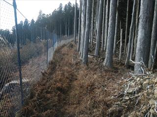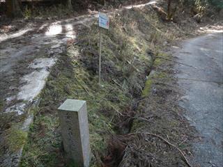 登った金網沿いを引き返し、極力境界杭に沿う 境界杭が打たれたところはわずかに凹み、古道の跡かもと思う 看板まで下る ここから北に測量されてはいるが踏み跡を感じない古道で下の林道?に下った 道はくねくねと曲がり、ハッキリと道を感じればその下は林道だ 林道?を西に歩けば、道は舗装になり耕作地の田が出る 全域は耕作されていないが、草が刈られ整備が有る さらに下り、左右に走る舗装路が出る ここで鋭角に向かう看板が出る |