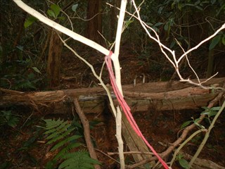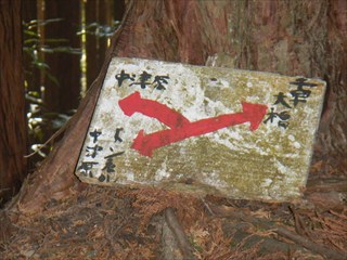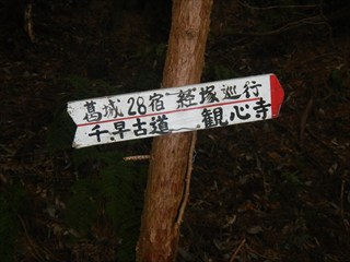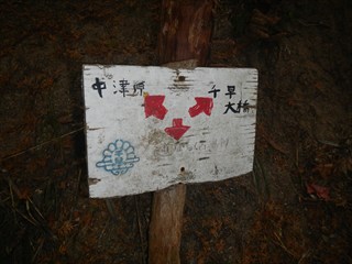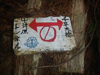 | 谷に登れば測量杭がでた この谷は道かと地形図を見るが、GPS確認では位置がずれるが、GPSのずれと思った そのうえで、堰堤が出た。あらら 小動物の跡を追った 一人あえぐショウタンだ 直ぐ上に、これまたお世話になる方の道しるべが出た 今日はここまでと、踏み跡で千早古道に引き返す 地形図道が出た これが、千早洞ができる前の道だろう ![]() 電波塔や踏み跡が濃く、最後は山仲間の印が出てわいわい |