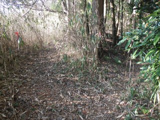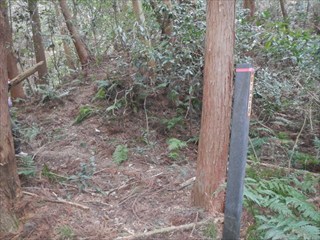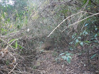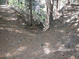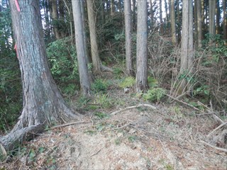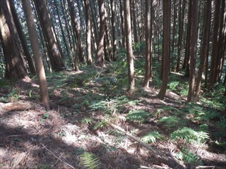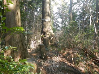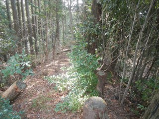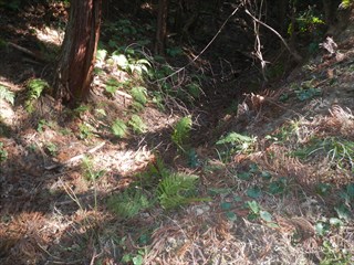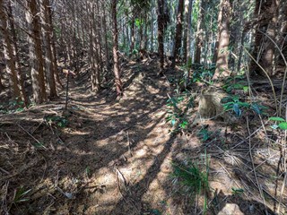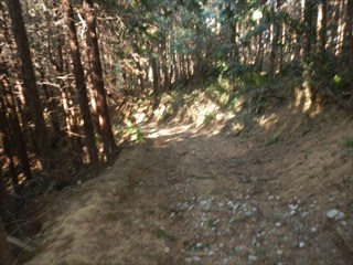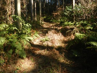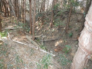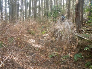 あらら、100mも下らない アラー林道だ 林道は地図には載らないが、見た感じはどうやら地形図破線の西下に通っているようだ 私の携帯には出なかったが、sunaoさんの携帯ではヤマレコの足跡が林道に出て、途中で引き返している 林道が終わっているのだろうかと話は合う 行けばわかると判断の早いsunaoさんは歩き出す 林道が分かれた GPS確認から、右手上に破線が載る 右手だ これまた判断が早い 登れば林道が尾根で終わり、尾根に破線道が残る やったー 思ったより歩きよい 小さな分岐尾根では必ず方向は確かめた 直ぐに見晴らしの良いピークが出た その先で堀切が出る これは小さな曲輪が有ったのかも 見晴らしがよいからだ 方向を確認する GPSも見た 間伐材は歩きにくいが、通れる 道が有ったのだろう 下に林道が見えた 最短で下った 下って地形図と現在地を合わせれば、そのまま林道を下れば良かったのだろうと話し合う 右手上には古道が残るはずと、ずずと登ればやはり古道跡が出た 林道が新しい道ということだ |