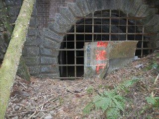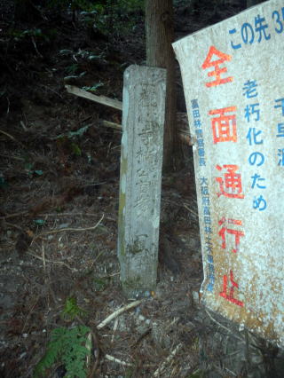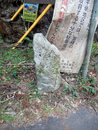 古道らしい雰囲気が出て旧千早街道に下る 千早大橋方面に出て、自然石道標や新旧の道標を確認する ![]() 自然石道標は字が読み切れない 旧千早洞に向かう 千早洞は歴史を感じる 地形図にはこの横から境界尾根に道が出る これが古道の山越えの跡かと、二人で谷に登った |