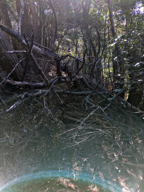 | このまま下山は早いと大野城跡に向かった 記憶で歩き地形図は見なかった 記憶ではピストンが頭に残る ![]() 所が反射板まだはフラットだがそこからはアップダウンが出る 小ピークや道のアップダウンで下り基調だが、帰路は登りになる リュックも重く体力が落ちた今ではと頭にエスケープが横切る ![]() 携帯でやヤマレコ軌跡を見れば大野城跡東側尾根や、城跡北側の尾根を直に下る跡が有る 大野城跡はいつもきれいで、昭和三年の石柱が建ちいかにも城後らしい 北に二段の曲輪とがあり行ってみる。 尾根先は守りのためだ急傾斜で、エッ、これを下るのと思う急傾斜だ 地形図に乗る破線は行けるかとか頭に迷いが出たが、林道まで地図では標高差40m程度だ 行っちゃえと、恐る恐る降る 落ちても左なら大けがもないだろうとそーと降った 尾根先らしいところで下を見れば林道が見えた 途中は伐採が有る 多分林道に下りるには道までは壁だろう ヤマレコ足跡は有るが、多分引き返した物もあるだろうと考え 谷の下で林道が終わっているから多分そのまま下れるだろうと谷に下る 来た道を引き返すよりよほど時間が早いだろう 下ったが、羊歯で足元が見えず、つかむ木はなく一歩ずつ足元を確かめ時にはお尻を使った 汗 一か所でズルって滑ったが植林につかまりやれやれ、下れた 予測は当たり林道終点に下りた ![]() |