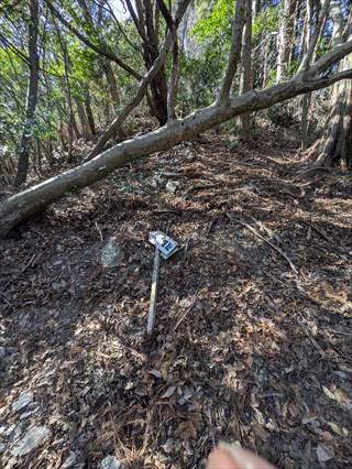 | 2026/02/19日 熊尾寺山から大野城跡 上をクリックでヤマレコ記事に飛ぶ 👆 体調も整い倒木処理に向かった リュックには撤去に必要なもの等を入れ久々に重いリュックだ 一年一年老いを感じるがマア山は楽しい 取りつきは雨の森からだ、前回の下見で感じた倒木を撤去するが、主に熊尾寺山巻き道です 一か所、引っ張れば落ちる大きな枝が有り、引き下ろしたがロープを忘れ体をぶら下げて引っ張った 体重が役立つ荒業だ 汗、ヘルメットは付けている ![]() 巻き道には数本の大きなものが有ったが一応撤去できた よくよく考えて状況を山から見れば、モトクロスの人が倒木を撤去した道かもしれない 熊尾寺山北の西光寺越しに出る 鉄塔が有り、地形図を見れば東側にも破線が書かれているではないか 行ってみようとバリエーション好きが頭をもたげた ![]() 破線道は管理道のようだ これは道は良いだろうと地形図を見れば熊尾寺三角点に登れるようだ しばらくは道が良いが、道は流されたのか斜面に成り歩きにくいが道は残る 一つ目の鉄塔が出る その先で道が分からず、電線下を歩けば次の鉄塔に出ると雑木の中に入る ![]() このままではと先を見れば道が見えた 鉄塔の何処かに道が有ったのだろう 道に入る ![]() 少し大きめの鉄塔が出て斜面は広い 今日は天気が良く、長峰山脈の山々が見張らせメチャ奇麗だ 黒沢山、生石山、大峰山に高野の峰の眺めは素晴らしかった 鉄塔から熊尾寺山に道が上る 山頂に突き上げた ![]() 二等三角点 点名(三角点の名前)引尾です 山の名前は、熊尾寺山です 北緯 34°07′58″.3507 東経 135°14′12″.5921 標高(m) 542.91 |