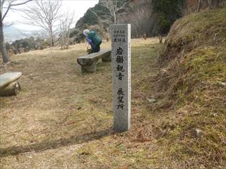 まず山頂に向かう 山頂は見晴らしもなく間伐材が転がる ここで昼食と座り込むが寒かった |