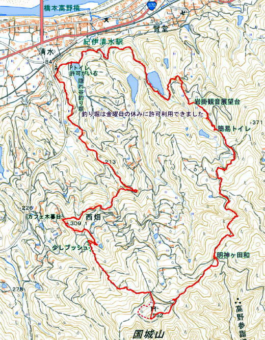 | さて 国城山には紀伊清水駅からの登山が一般的だったようだが、どうやら今は黒河道へと変わっているようだ 下山で知ったが、紀伊清水駅と国城山最短コースは今も古い道標やその名残が出る 今回の下見は登りは黒河道に準じ、下山は紀伊清水駅への最短ルートをとった 金曜日が定休日の隠れ谷へラブブナ釣り池駐車場に許可を得てここをスタート点とした 釣り堀用の駐車場ですから定休日以外は駐車の許可が出ない 定休日以外ならなら、和歌山県伊都郡振興局に駐車場があるが、黒河道用として解放はされていない 停められるかは問い合わせが必要だがマア勝手に止めればとという意味のようだった 池横から地図を見ながら黒河道を目指す 最初は細い舗装路でした 道なりに行く 池が出て舗装が未舗装になり黒河道に出れば、道標から細い古道に入る 👆 どの分岐も道標や旗などの案内があり道を外すことはまずないだろう 振り向けば見晴らしが出てそれは景色が良い 岩掛観音休憩所はもう最高でユックリと休んでしまう |
