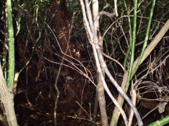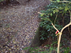 | 猪檻東側に古道跡がハッキリと有る、これを尾根先に向かって古道跡を登ればいい 時々は登る方が有るのか小枝が払われている。中程になるとシダが生え道が不明瞭になると小枝の払い口通り登って行けば道がある 取付き付近 古道 猪のヌタバ シダブッシュ(脛切り) 山頂近し 尾根頭の鉄塔に出る 鉄塔からは管理道がありルンルン、私はここまで上から下る事があるがこの時期の落ち葉の踏みしめる音が大好きだ |