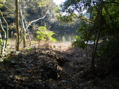 | 道横の作業小屋から下ると河原に降りられる。この河原の出会いに取付き道がある 登ると、畑跡があり一段目は柿の木が植えられ下草だけが刈り取られているがこの上が大変だった ブッシュと田の跡の石垣、これを登らなければ成らない。階段が無いか探したが見つからず、強引に登りブッシュをかき分けた 今度は手入れのされていない杉林は倒木で歩けない、ウロウロ、何とか進むと突然古道が現れ、猪檻があった ウン どこかに道がある。チョット探したが見つからなかった 尾根先川の出会い 倒木帯 猪檻 後日、尾根取り付きの道を探した。方法は2つ有った 1 同じく尾根先から入り、一段目の畑の右手、(東奥)から回り込むと昔の畑道が有る 少しブッシュだが行きよい 2 作業小屋から墓の谷方面に200m程度?行くと左手に用水路取水口の堰堤がある。この堰堤を渡る(水のない時期は有効)と右岸に道がある。これを下って行くとブッシュがあるが手前の石積みを登ると道がある |