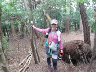 | グーグルマップを開き拡大すれば疎水公園や諸葉山 柳山 蔭山 などが記されている 地形図には反映されず如意ヶ岳と大文字山のみが記されている ここはリーダーに従った 疎水公園でトイレを済ませ、その横の登山口から登り始める いきなりの急登だが登りよい 足を痛めているからどん尻をよっこらしょと登る すぐに諸葉山に出るがここは板の山名板は無い 道なりに歩けば良い 小さく下りこめば白岩という石が出るが、注連縄などは無い 踏み跡も濃く分かりよいが、柳山や蔭山は見落とすほどピークは丸い 蔭山の位置を間違ってコンパスが合わないとブツブツ、リーダーはここですと指をさす のんきそうだがリーダーも準備はバッチリで、頂いた資料は力作だった どこで探したのか大文字山の資料は分かりよい 余り休憩もなく歩くが四人だが、現在地はしっかりと読んで歩いたが、ここが近いのではと薄い踏み跡に入れば、キッチリと間違った 引き返さないショウタンは、すました顔でどんどん進み、本来のルートに乗った コースは踏み跡に沿うのがいい 倒木は多いが整備がある 私有林だが整備は行政がしているようだ 指定道を外して歩ける状態の倒木ではない |