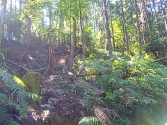 ![]() 食事を済ませ、来た道に引き返す 近畿自然歩道に下り、途中から御園の林道に入る ![]() 途中から象山への尾根に入ろうと取り付き点を探していると、新しい林道が開かれ、木が切り出されていた これを利用しない手はない、思った方向に林道が延びていたが、途中から尾根のソマ道に入り、尾根を進と、又林道上に ウン、これは象山方面に伸びていると見たが、これが失敗で、又尾根に登る ![]() アップダウンや尾根曲がりが多いコノ尾根は、現在地特定がたやすい 四等三角点、押垣内は簡単に見つかる 北緯34°22′00″.9919、東経135°53′09″.6683 標高459.98 所在地 奈良県吉野郡吉野町大字御園642番 ここからは少し歩きにくい尾根だが、ブッシュではない 象山手前のコルに踏み跡が下っている。下山道はこれだと思う、象山に向かうが、羊歯内の踏み跡、山頂には図根三角点がある。ここにも好き者が登っていた ![]() ![]() |