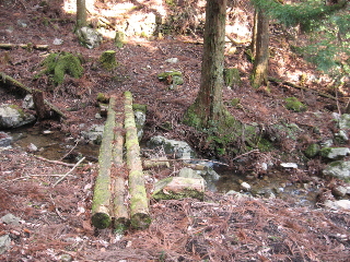 | P848mに引き返し、尾根を下って行くとアレレ、踏み跡が小さな細い支尾根へと下って行く 説明は難しい、地図で見て下さい ![]() P848mから尾根の写真 ![]() P848mから尾根を下って行くと広い垰状の沢に係る丸木橋に出る。ここで踏み跡が消える。待てよ、直ぐ横に炭焼き釜の跡、ここに来る道があったはず、それらしき物が沢沿いに下る。有った有ったと喜んだが直ぐに不明瞭になるが、小枝の切り払われた跡と靴跡がある 行政の指定道ではないだろうが、とにかく下れた。名知らず滝が現れるとすぐ下が林道、5〜6分くらいの時間だ ![]() 沢沿いと道跡か??? ![]() 名知らず滝の下が林道だ、林道登山口まで200m?くらいだった。どこかでルートを見落としたはずともう一度登山口から白馬山に登ろうと話し合い取付いた ![]() ![]() 登山口から道は西に向かっている。良い感じだ。途中で尾根に登る踏み跡と西に向かう踏み跡、尾根に登る道はたぶん赤波線道だろう 青い線は丸太橋の上で道ヌケがしていたが小さな踏み跡が丸木橋に向かっていた 丸木橋の正面東側上に道があったのだ。これを見つけられなかった。反省。ここに目印を打っておいた カメラのデーターが間違っていたので細かいデーターはないが全時間7時間50分と面白いコース設定が出来た |