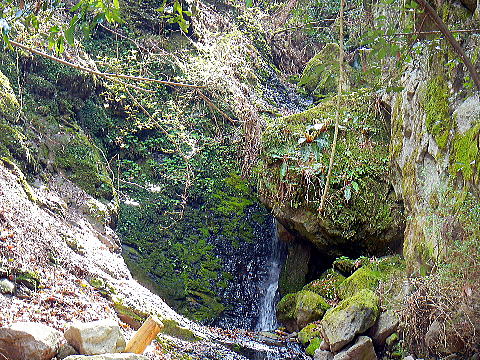 | 昨夜は囲炉裏前で一人酒を楽しみ少々泡盛を飲み過ぎて、コースの読図が出来ず寝た、とにかく粉所に向かう。 最短で登ろうと、沢道を選んで取付いた。駐車も少し先に広場がありラッキーだ 所が、谷の炭波線は完全に無くなり沢登りなんて状態になり、アララ、行けるかな何て状態だが、地図を眺めるとダメなら北西側の尾根上に道が有るさと気楽に登った。(新国土地理院マップにはこの道が載っている) 日暮山 ↑ 取付き↑ 最初は沢上に小道が出たが100mも行くと写真の状態だ。やはり沢道は流されない 水に濡れるとマダマダ冷たいだろう。気温も下がり3月並みとか、小さく岩を巻くがロープを出そうか迷う 何とか巻き込み登ると、そこには道など無い状態だが、測量はされているようだ とにかく登山靴で沢登りだがこれが滑る岩質で、斜爆などは小石を置いて滑り止めにして這い登るが、オットスベルだ 右岸は何処も高巻けるが、左岸は全て垂直状態の岩だ。少し大きな滝は50m程巻登った とにかく沢沿いを登った。 ガレ場の斜面をトラバースしたが、良く締まりルンルン、と先に石積み堰堤が出た シッカリした堰堤だ、巻かずに登ると、あら取水ホースがあり右手に小道が、新国土地理院マップにこの道が載っている 登山計画は時間をかけて練る物だ。汗 左手に行けば、古道だろうが、かまわず沢を登った。 所が、大岩の10m程度の滝が出た。 ![]() |