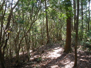 | とうとう行き詰まったが、右手の岩横に梯子がかかりっている。取水口は此処だった 此処でシンケンに読図するが、アラここは何処と、現在地を完全に失った。 エーイ、谷入り口から日暮山にコンパスを合わせた。 モウ適当も良い所、昨日の泡盛が思考を鈍らしたか 汗汗 右手大岩下に石室がある。ダメならあそこに寝よう何て暢気な物だ 右手の階段を登ると又行き詰まるだろう。雑木の尾根に測量テープらしい物が見えたが、植林の尾根を登った 日暮山山頂方向はおおむね掴んでいる。真っ直ぐ登れば山頂だが地図の通り等高線が混む 半分は岩のようだ。 なるべく傾斜の緩い所をクネクネ登る。途中に植林道などが出て適当にそれに沿った ヤヤ広い植林帯が出て、タブン此処だろうを掴んだ。そこからコンパスを取ってみると、上正面が日暮山と出た 石積みなんかが出る。炭焼き釜の跡だった とにかく登れるように登るが、とうとう岩質になる。その間に境界杭が打たれているからコースが有るのだろうが、単独で登る用意はない。岩下を巻きながら日暮峠からの尾根を目指した 一つ目の尾根がそうだろうと登るが岩に突き当たり違うようだ さらに目標方面に向かうと、テープが一巻き、これだろうと登ると、有る有るテープがイッパイだ 信じて急傾斜を這い登る |