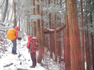 | 早朝六時に川合に集合して、車二台を虻トンネル観音峰登山口にデポして、一台5人で母公堂、稲村登山口に移動した 小雨か粉雪か分からない空模様、約1時間天気の様子を見る。 行けると判断したショウタンリーダーは、登山準備をメンバーに伝える 登山開始は目的より約30分遅い7時36分に成った ![]() メンバーは炉端山友会の中でも経験豊かなパワーウーマン四人と私、リーダーは一番体力が無い私 立ち休憩はするが、法力峠、マンモス象の立ち木とドンドンと登る 登山道は雪も少ない、 先日来の雨と暖かさが雪を溶かしたのだろうが、登れば上るほど道が凍り、後50mの橋崩落付近は完全に氷り、アイゼン着用は自己判断で二名が装着した。 |