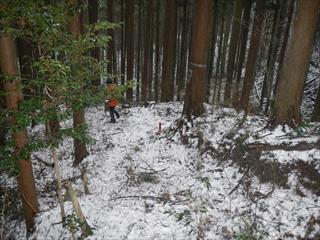 読図でコルに下り貝ヶ平山に向かう。ルートは境界尾根だがこれはひどいブッシュだが、ウンの強い5人は、測量のため刈り取られたコースから、上手く通常登山道に出た ![]() 黒線道は軽四なら入れるだろう道だ 通常はこのコルから貝ヶ平山に登るという ![]() 黒線道コル 貝ヶ平山取り付き道、谷を道成りに登る |