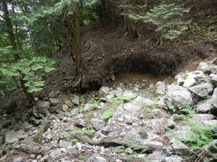 | 登山口の沢まで戻り、地形図から花抜峠への道を探った。 本流側左手直ぐの右岸にロープやテープが巻かれた道が有る 慌てない慌てない。渡渉がいる。昨日の雨で渡渉は慎重に飛び石を渡るが、川幅は小さく水の流れは2m程度だ ![]() 取り付けば道成りに登れば良いが、どうも地形図とはルートが違うようだ。 二度のアルバイトはしたくないと真剣に地図を眺めると方向があっているが、道の標高がおかしい 途中に道抜けや分岐は無かった。コレで良いだろうと、地形図の破線道位置が違うのだろうとの判断で登った。 ![]() 小さな沢の渡渉や植林内の道、小さな滝が有る沢を越えたりとしてゆき、尾根角度や尾根地形から現在地を探った。 ![]() |