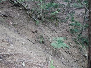 | 花抜峠から川上村まで土倉道は続いていたようだ。 花抜峠の標柱には、旧堂倉道、西谷、大台辻と書かれている。 大台辻からは承知の土倉道、筏場への道だ。 尾根で行こうか、古道を伝おうかと話し合い、古道跡を探る。 ![]() 何の疑いもせず道成りに歩けば、小さな谷の道抜けが数ヶ所有るが、私達には問題は無い 道は荒れだしソマ道風に成った。 ここでGPSの登場だ。アララ、道をはずれ大きく迂回している 地形図から判断して沖見高ルートに出会うはず、そこで引き返せば尾根に楽に乗れると主張したが、アララ、道が完全に抜け向こうは難易度が高い 斜面を這い登り、目的尾根に登った。 登る途中で、GPS確認をしてみたが、地形図にはやはり道が載る。??良く有る話と尾根を目指すと、賑やかなマークが出た。 ![]() |